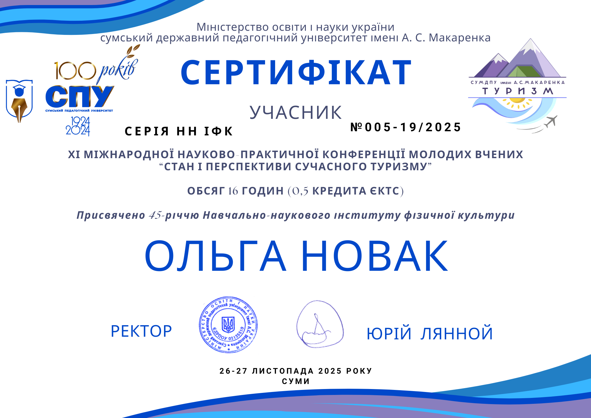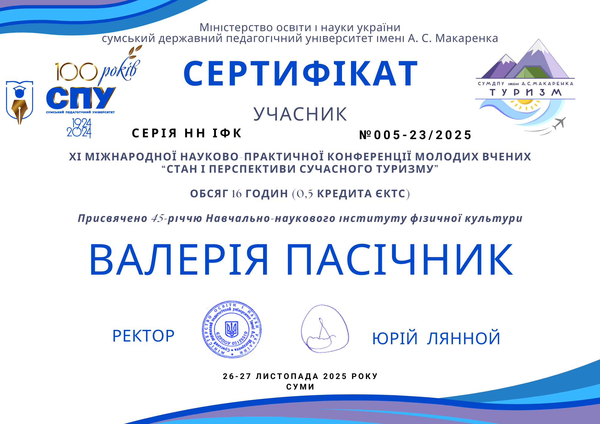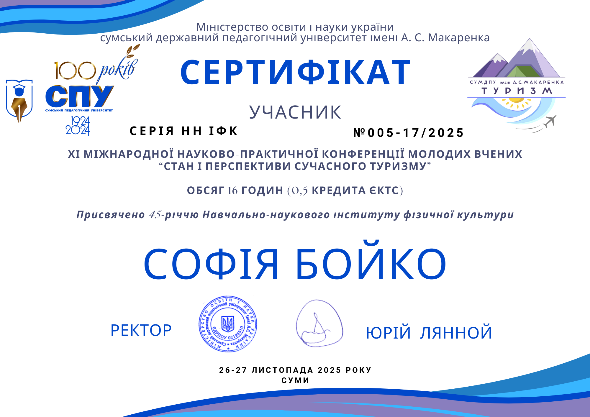 26 – 27 листопада 2025 року у Сумському державному педагогічному університеті імені А. С. Макаренка відбулася ХІ Міжнародна науково-практична конференція молодих вчених «Стан і перспективи сучасного туризму» у заочному форматі.