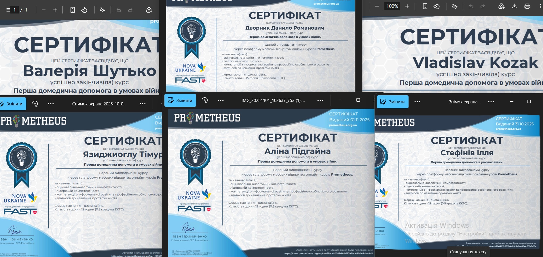 В рамках вивчення навчальної дисципліни «Долікарська допомога при невідкладних станах та патологічних процесах» у І семестрі 2025-2026 навчального року, здобувачі 936 групи спеціальності 227 Фізична терапія, ерготерапія, пройшли онлайн-курс «Перша домедична допомога в умовах війни» на платформі Prometheus під керівництвом к.б.н., доцента, завідувача кафедри туризму та медико-біологічного супроводу Латіної Г.О.