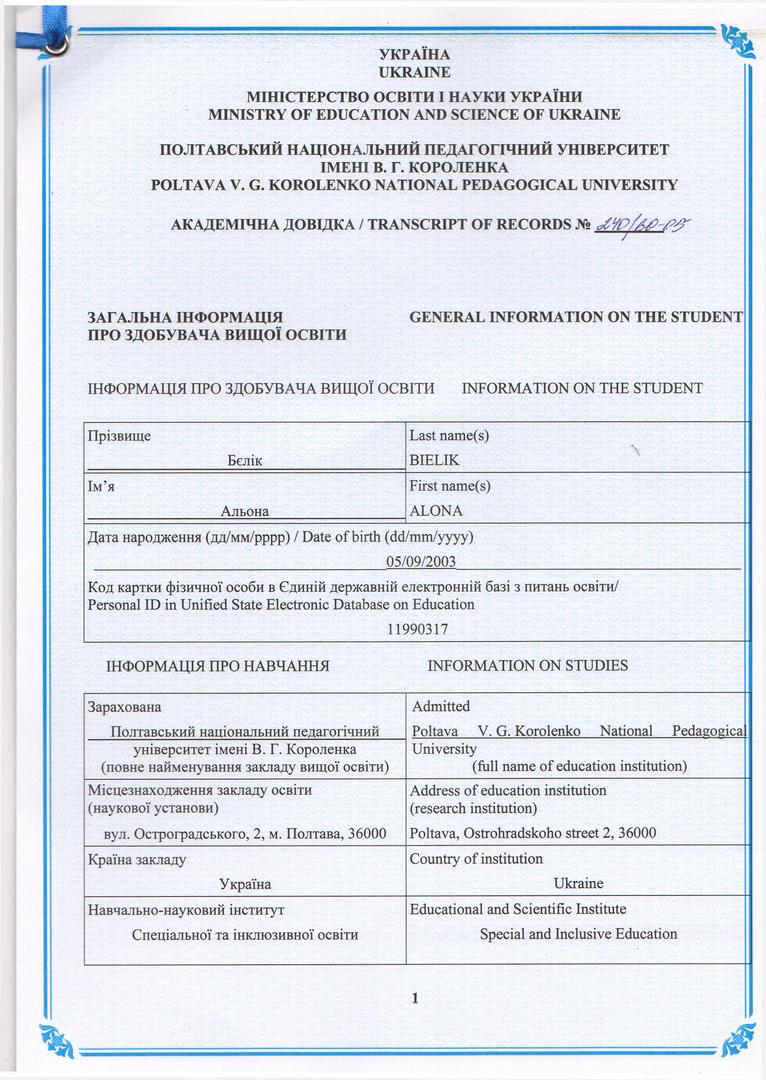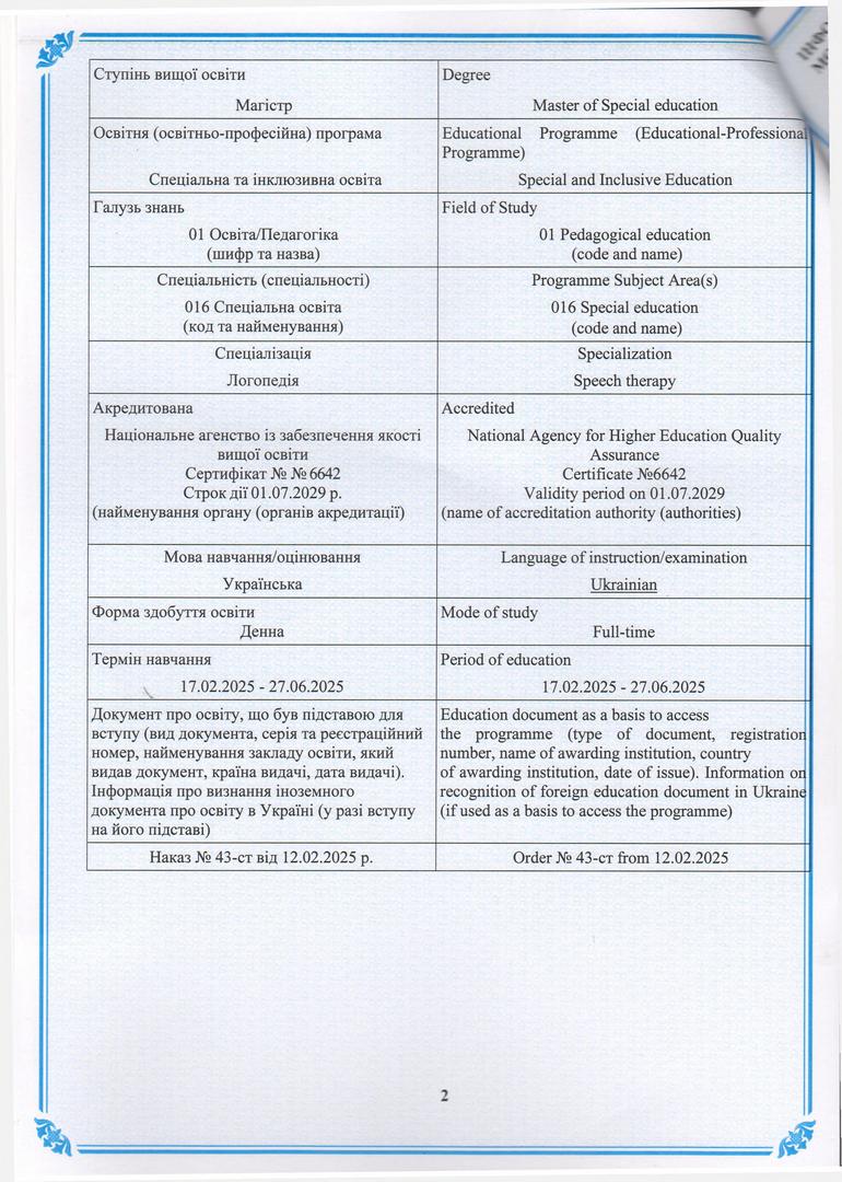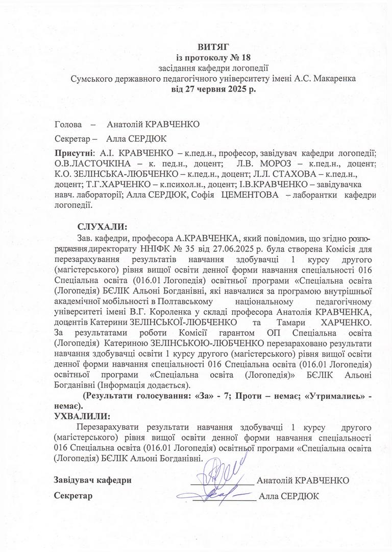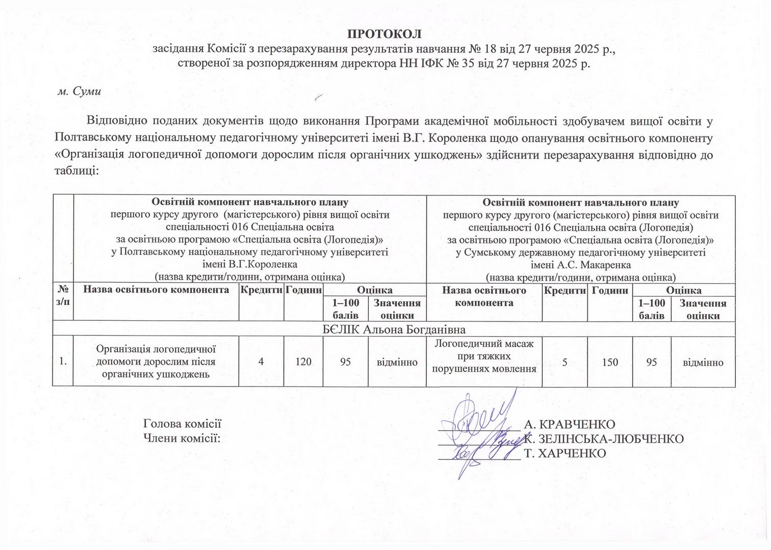 27 червня 2025 р. відбулося перезарахування результатів навчання здобувачці 1 курсу другого (магістерського) рівня вищої освіти денної форми навчання освітньої програми Спеціальна освіта (Логопедія) БЄЛІК Альоні, яка навчалася за програмою внутрішньої академічної мобільності в Полтавському національному педагогічному університеті імені В.Г. Короленка.
