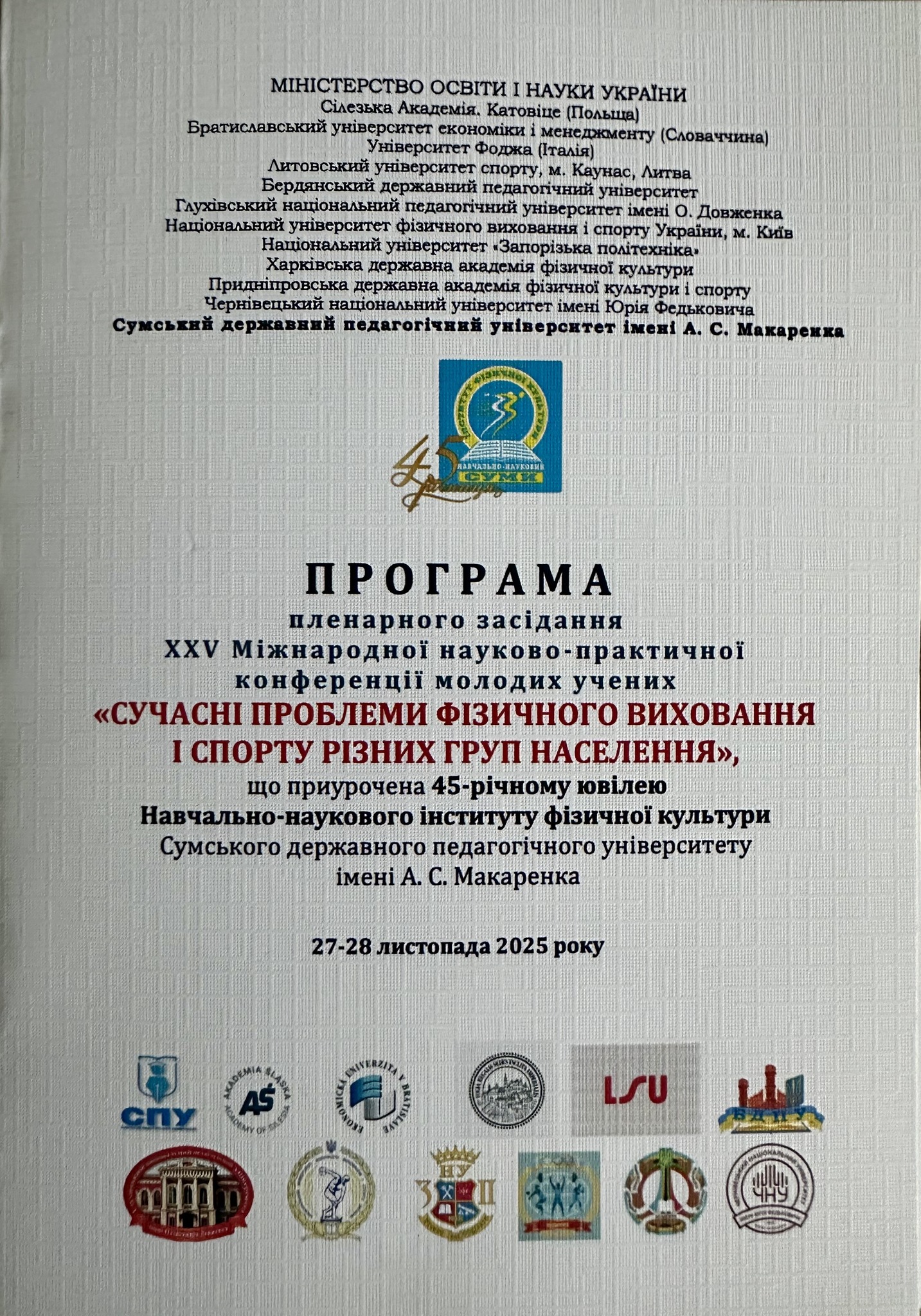 27–28 листопада 2025 року кафедра теорії та методики фізичної культури виступила організатором пленарного та секційних засідань XXV Міжнародної науково-практичної конференції молодих учених «Сучасні проблеми фізичного виховання і спорту різних груп населення», присвяченої 45-річчю Навчально-наукового інституту фізичної культури СумДПУ імені А. С. Макаренка.